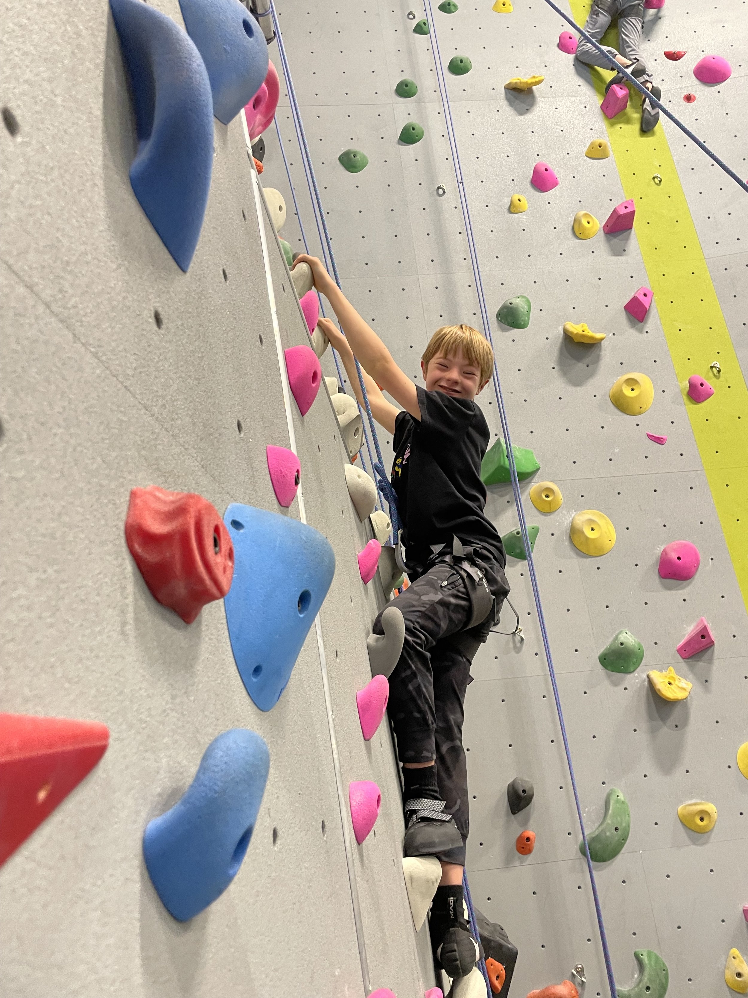 If you show up to the Teton County Community Recreation Center and the climbing gym on Wednesday afternoons, you will find hordes of middle schoolers participating in Climbing Club. They are learning how to belay, practicing rope safety skills, and challenging themselves to climb the next grade. This is not necessarily unusual in a town like Jackson. But if you look closely, you may see a 12 year old boy with Down Syndrome scampering his way up the wall and carefully downclimbing alongside his peers. This little boy is Crosby.